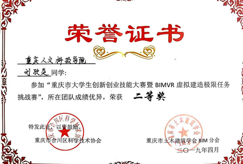 本次比赛为期五天,其中包括赛前培训两天,参赛作品创作两天,作品汇报展示及颁奖一天。beat365官网选派“营造渝都”和“Soul Calibur”两支队伍参加比赛,他们在培训中废寝忘食、挑灯夜战;在比赛中,团队协作,各司其职。最终,工商学院亢磊磊老师指导的,由刘欣炎、陈前松、何坤组成的“营造渝都”团队获BIMVR虚拟建造极限任务挑战赛二等奖,建筑设计学院马玲老师指导的,由汤张彬、庄文兵、黄峥组成的“Soul Calibur”团队获BIMVR虚拟建造极限任务挑战赛三等奖。