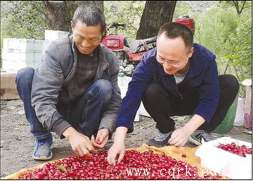 图为徐俊(右)帮助群众挑选樱桃,以便在网店上出售。