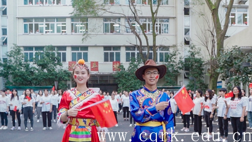 身穿民族服饰的师生代表领唱