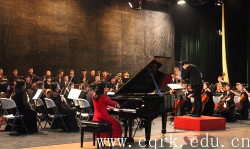 演出接近尾声,乐团演奏了由冼星海先生作曲的《黄河钢琴协奏曲第二乐章——黄河颂》,在大提琴缓慢庄严的旋律中,引出独奏钢琴的反复呈述,钢琴铿锵有力的和弦似乎述说着中华民族的坚忍不拔之魂魄,全场气氛达到高潮,掌声雷动。