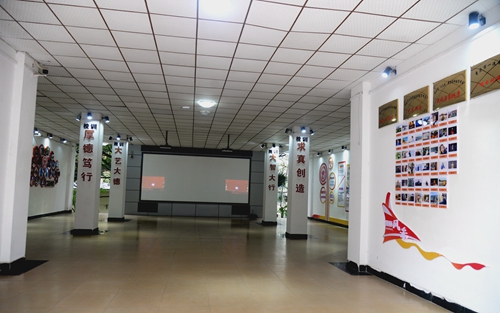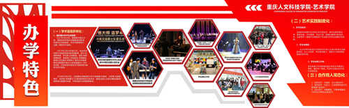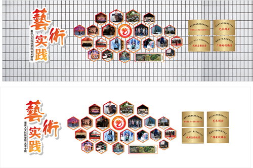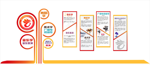 学院确定了以红黄系为主色调的视觉传达体系,旨在展示艺术学院师生的热情与活力,通过巧妙构思,将学院三大专业方向的特色在院徽上融为一体。根据设计构思,在学院两座主体教学楼(广艺楼、八音楼)开辟学院沿革、学院概况、办学思路及目标、办学特色等板块,配以图文集中展示艺术学院成立五年多来在学科建设、专业发展、艺术实践等方面的成果。彰显学院特色,营造“有精神、有内涵、有特色”的育人环境。