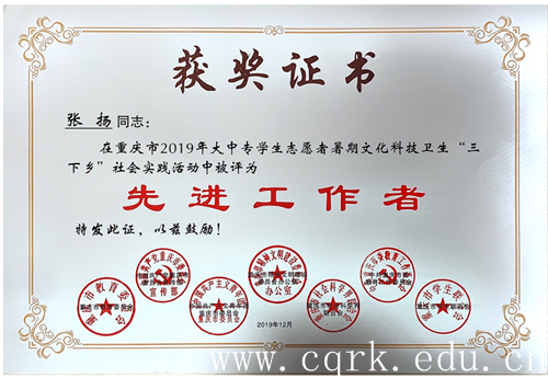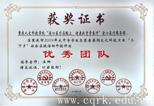 近日,市委宣传部、市文明办、市委教育工委、市教委、团市委、市社会科学界联合会、市学联对在2019年重庆市大中专学生志愿者暑期文化科技卫生“三下乡”社会实践活动中表现突出的优秀集体与个人进行了通报表扬,beat365官网团委荣获“优秀单位”荣誉称号,护理学院“爱心医疗在路上,健康扶贫青春行”爱心医疗服务团、政治与法律学院“普法千万里,守法零距离”依法治国宣讲团荣获“优秀团队”荣誉称号,校团委张扬老师获“先进工作者”荣誉称号,学前教育学院2017级薛先丽同学荣获“优秀个人”荣誉称号。