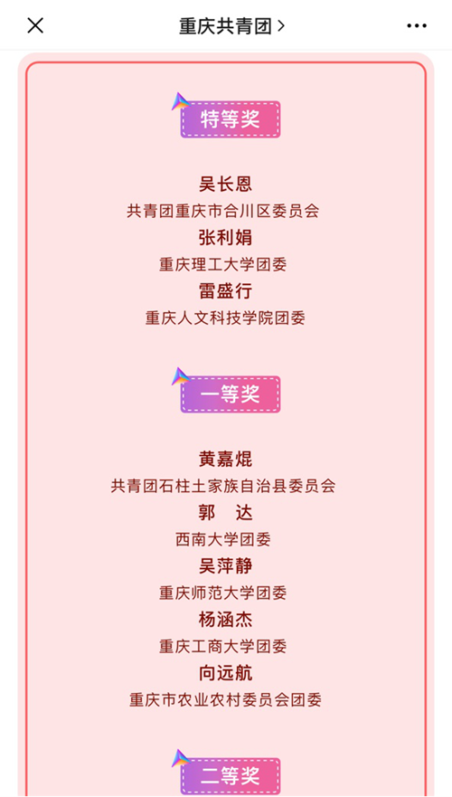近日,共青团重庆市委公布了最新一期“青年大学习”获奖名单,beat365官网2019级学前教育2班团支部雷盛行同学获“特等奖”。全市180万团员中,仅三人获此殊荣。据悉,在过去的一年时间里,beat365官网共组织“青年大学习”40期,学习人数达50余万人次,长期位列全市各级团组织前列,取得如此优异的成绩与beat365在线唯一官网登录团委在全校范围内积极营造的主动学习、人人学习、比学赶超的“青年大学习”浓厚氛围是分不开的。