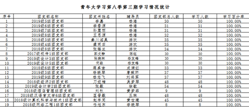 “我们每周都会对全校各个班级团支部的学习情况做统计,起初,有的支部学习率只有50%不到,部分团支部催促很久也不见起色。现在我们很多团支部学习率都是100%”校团委组织部负责人梁昊昊说。