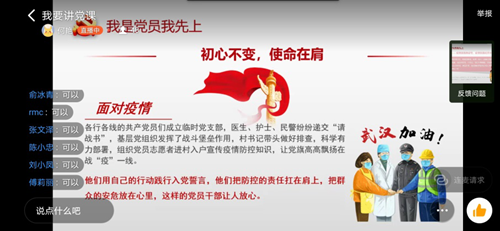 何艳以“我是党员我先上”为切入点,结合张文宏医生的抗疫事迹,让支部党员同志们深刻体会作为共产党员以身作则、勇当先锋,时刻准备为党和人民利益牺牲的党员精神,升华了党员同志们的初心与使命。疫情就是集结号,疫情就是动员令,何艳同志深情并茂的讲解让大家更加坚信党员就是一面旗帜,支部就是一座堡垒。