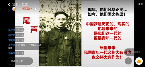 3月30日,艺术学院学生第一党支部全体党员通过钉钉视频直播开展了本学期第一次“我要讲党课”系列主题党日活动。2017级音乐表演何艳担当此次党日活动主讲人,她以“在疫情大考中,用信仰之光照亮奋斗征程”为主题,为大家生动地呈现了一堂党课。