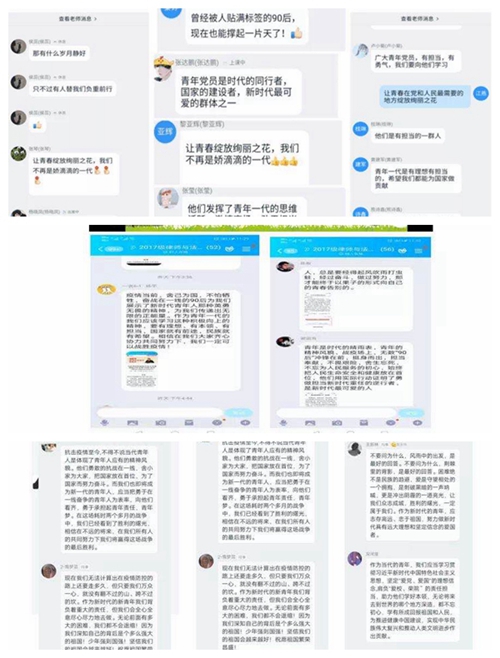 各学院党总支积极开展“学习习近平总书记给北京大学援鄂医疗队全体‘90后’党员的回信精神”线上学习分享活动,结合全国抗疫形势,师生党员骨干分享心得。2018级会计专业张莹同学表示,作为当代大学生,虽不能奔赴前线,但是要用自己的方式展现出属于这一代人的责任与担当,要尽自己所能,在家乡出一份微薄之力抗击疫情;计算机工程学院辅导员左雪老师结合所带专业特性,通过钉钉开展了一堂别开生面学习动员班会,她强调“大家虽不是医务人员,但依然可以发挥自身专业特长,投身到相关防控工作中。比如,通过大数据分析在数字管理中心完成疫情原始数据整理,或者前往地区医院,以信息化辅助员的身份协助工作开展。青年一代有理想、有本领、有担当,国家就有前途,民族就有希望。”“总书记的回信,极大鼓舞了当下‘90后’一代。”学校团委副书记张扬表示,作为身负联系青年、引导青年重任的基层团干,要把不惧风雨、勇挑重担的精神贯彻落实到履行引领凝聚青年、组织动员青年、联系服务青年的各项职责之中,以实际行动为人民服务!