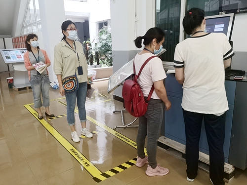 演练共分为两个部分,一是读者入馆演练,二是突发情况处置演练。预约好座位的读者在图书馆入口外佩戴好口罩,间隔1米距离排队等候入馆,依次就体温检测、扫码签到、刷卡入馆、分座阅览、间隔借书、扫码退坐等环节予以演练。当发现体温异常者,按照规定流程及时上报,工作人员将其带入隔离区,询问情况并做好登记。