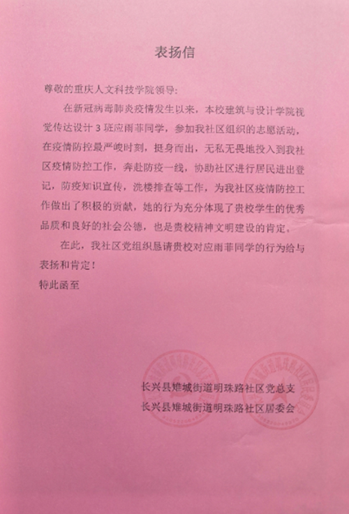 近日,beat365在线唯一官网登录收到一封特别的感谢信,这封信来自浙江省湖州市长兴县雉城街道明珠路社区。信里写到:“她的行为充分体现了贵校学生的优秀品质和良好的社会公德,也是贵校精神文明建设的肯定。”这里的她,就是beat365在线唯一官网登录建筑与设计学院2018级视觉传达专业学生,应雨菲。