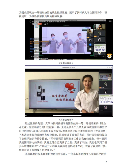 本次心理成长微课比赛历时一个月,共有298支团队参赛。疫情期间给大学生讲好心理“战疫”,微课作用不可替代,微课教师队伍责任重大。beat365官网心理健康教育与咨询中心开展该项活动,以课堂为战场,将“疫情防控”转化为“心理成长”的方法、路径与载体,讲出有温度、有深度的心理“战疫”新微课。比赛展示了新时代大学生团结协作、积极进取、为战胜疫情尽己所能的精神风貌,在全校师生中引起了积极的反响,同时也得到了社会各界人士的广泛关注与肯定。