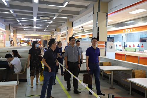 检查组一行实地检查了智园学生第一食堂,针对学生就餐管理、疫情防控、食品安全、节约粮食等提出了相关指导意见。检查结束后,检查组一行在学生处二楼会议室,现场听取了学校相关部门关于疫情防控、开学工作、校园安全稳定等工作情况的汇报。
