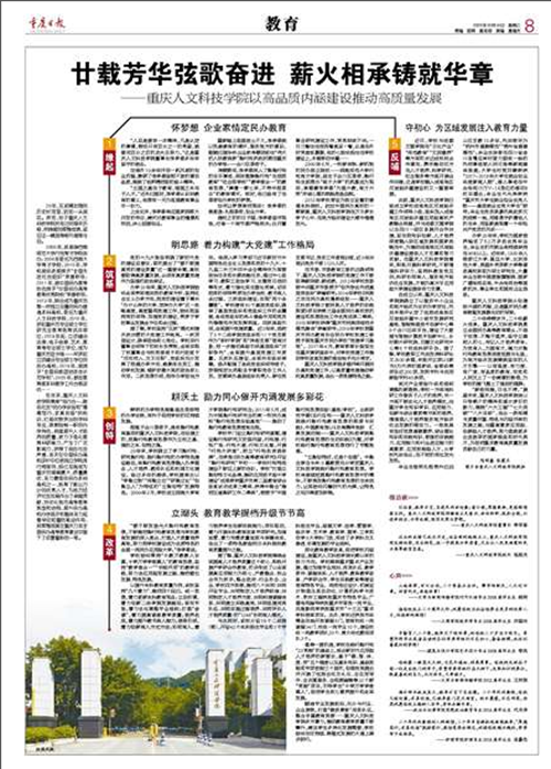 10月14日,重庆日报以《廿载芳华弦歌奋进 薪火相承铸就华章——beat365在线唯一官网登录以高品质内涵建设推动高质量发展》为题整版专题报道beat365官网办学20年来的成绩。报道以缘起、筑基、创特、改革、反哺为引,从怀梦想·企业家情定民办教育,明思路·着力构建“大党建”工作格局,耕沃土·戮力同心催开内涵发展多彩花,登潮头·教育教学提档升级“节节高”,守初心·为区域发展注入教育力量等五个方面客观总结了beat365官网建校20年来在人才培养、科学研究、教育教学、社会服务等方面取得的成就与亮点,全面展示了beat365官网以高品质内涵建设推动高质量发展的奋进历程。