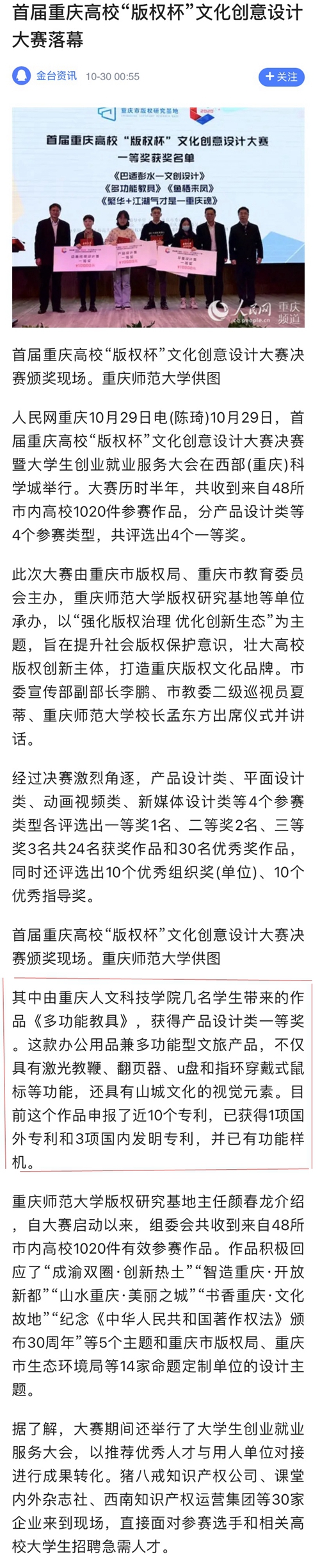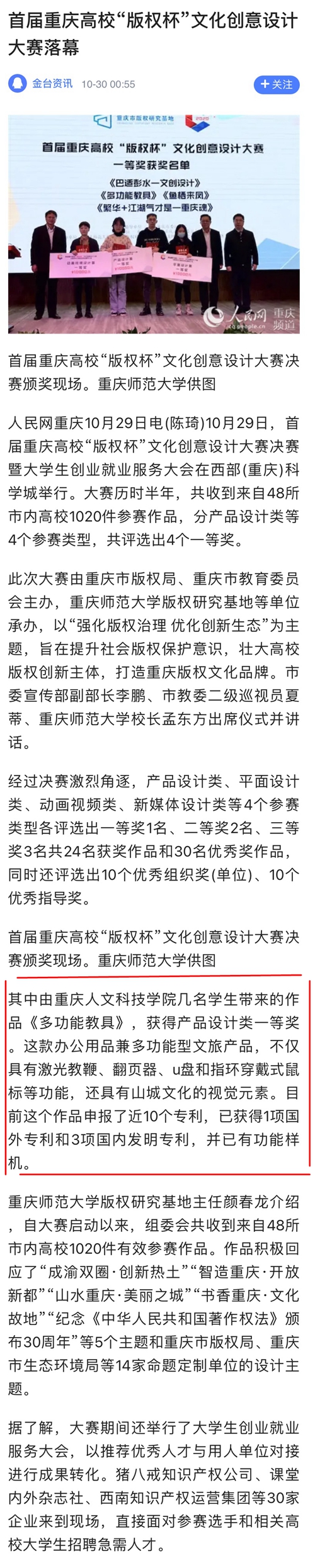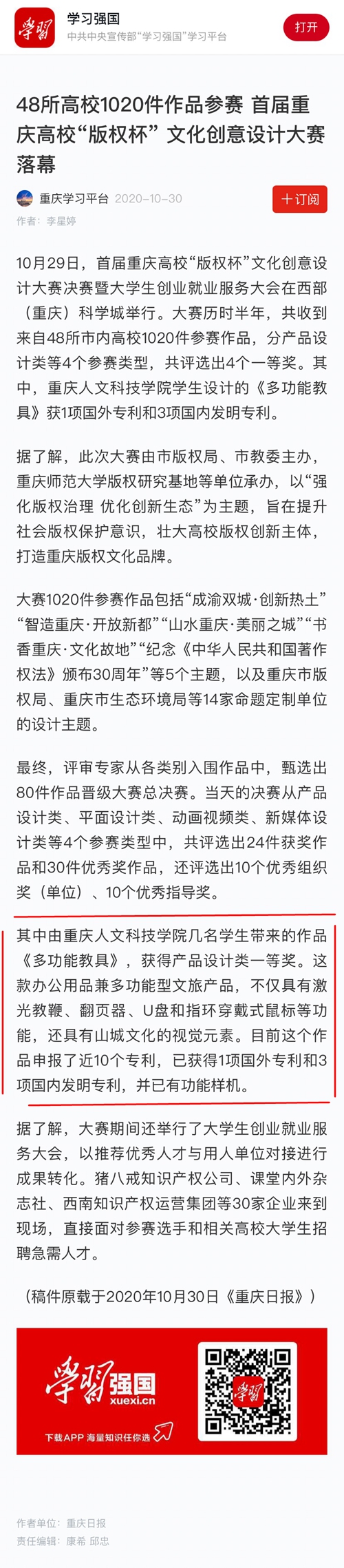 10月29日,beat365官网设计作品《多功能教具&美丽之城》荣获2020年首届重庆高校“版权杯”文化创意设计大赛产品设计类一等奖。因其多功能属性、兼具山城文化元素、拥有版权并申报10项专利、已获1项美国专利及3项国内发明专利等广受关注,被人民网、新华网、学习强国、《重庆日报》等多家主流媒体点名宣传报道。
