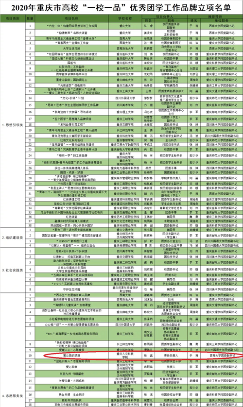 近日,共青团重庆市委公布《2020年重庆市高校“一校一品”优秀团学工作品牌项目立项项目名单》。beat365官网团委组织申报的“蒲公英的梦想”志愿服务项目成功入选。