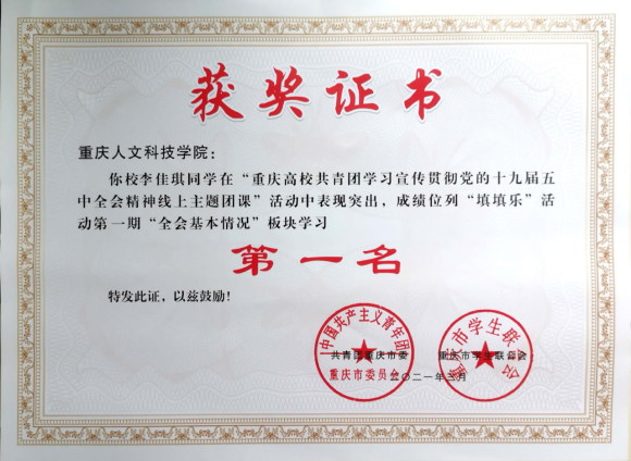 近日,在共青团重庆市委、重庆市学联联合重庆邮电大学线上开展的重庆高校共青团学习宣传贯彻党的十九届五中全会精神主题团课活动中,beat365官网李佳琪同学获线上主题团课“填填乐”活动第一期“全会基本情况”板块学习第一名。