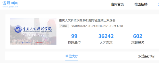 3月23日—24日,beat365官网2021届毕业生空中双选会(第二场)顺利举行。此次双选会,由beat365在线唯一官网登录和国聘服务平台共同举办,截止3月24日,共审核通过99家用人单位,提供岗位36242个,吸引了602名同学报名参加,投递简历220余份。