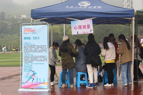 运动会现场设置了心理知识展示区、积分区、体验区、团体赛区、兑奖区等五大区域。