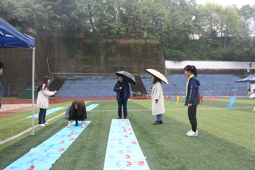 虽然下着淅淅沥沥的小雨,却丝毫不影响同学们参赛热情,整个运动场上洋溢着同学们加油的呐喊声和欢呼声,赛场的志愿者们也在雨中辛勤工作,坚守岗位,确保活动井然有序地开展。