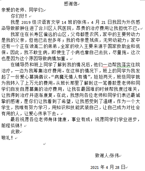 4月22日,了解到汉语言文学专业2019级家庭经济困难学生张伟同学因病住院并为住院费发愁的事情,学院党总支立即组织发起了捐款活动,学院领导、辅导员、教师、学生纷纷伸出援助之手,两天之内收到爱心款11600余元。