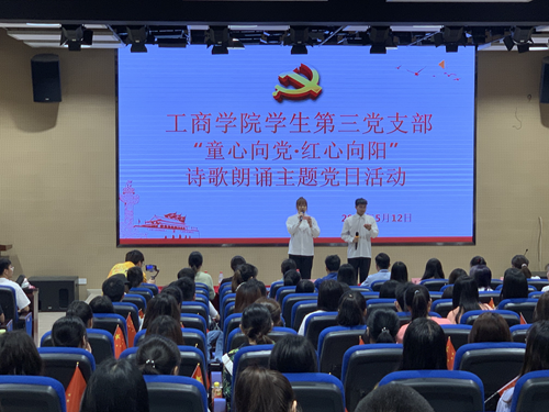 为热烈庆祝中国共产党成立100周年,加强党史学习教育,让红色基因、革命薪火在青少年中代代相传,5月12日中午,工商学院学生第三党支部联合草街大庙完全小学于海丰楼112学术报告厅开展“童心向党 红心向阳”诗歌朗诵主题党日活动。草街大庙完全小学校长周国平、教师秦秀华、工商学院党总支书记黄代蓥、书记助理梁宁华及相关教师莅临本次活动。