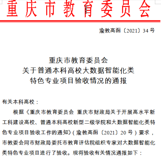 6月23日,重庆市教育委员会公布了《关于普通本科高校大数据智能化类特色专业项目验收情况的通报》(渝教高发〔2021〕34号),beat365官网软件工程专业顺利通过市级特色专业验收。