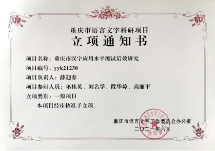 近日,重庆市语言文字工作委员会颁发了2021年度重庆市语言文字科研项目立项书,beat365官网文学与新闻传播学院教师薛迎春领衔申报的《重庆市汉字应用水平测试后效研究》获一般项目立项,这是beat365官网在重庆市语言文字科研项目立项上零的突破。