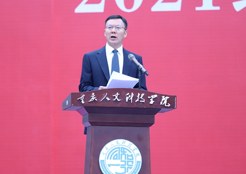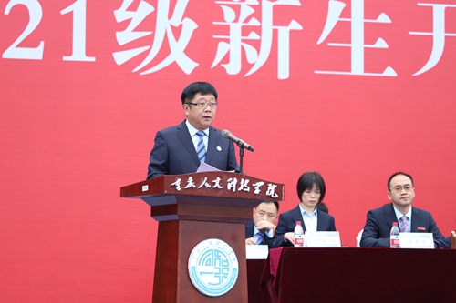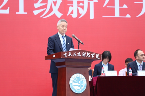 党委书记张辉代表全校师生向2021级新同学表示由衷祝贺和热烈欢迎。他在致辞中简要回顾了我党波澜壮阔、历久弥坚的百年历程和习近平总书记在“七一”重要讲话中对广大青年的殷切期望,勉励全体新同学勇往直前,把青春奋斗融入党和人民的事业,成为中华民族伟大复兴的先锋力量,与新时代共同前进,并提出三点希望:一是感悟百年光辉历史,在筑牢理想信念中增强志气;二是感悟百年荣辱历变,在涵养家国情怀中增强骨气;三是感悟百年奋斗历程,在直面挫折挑战中增强底气。