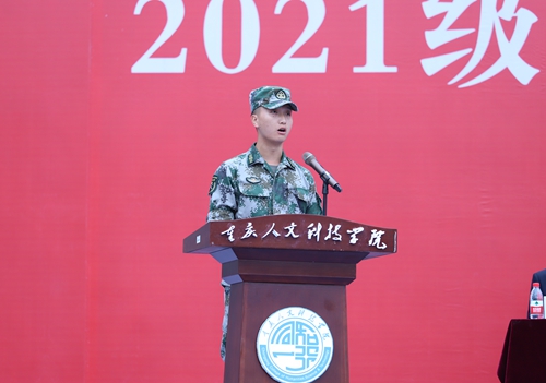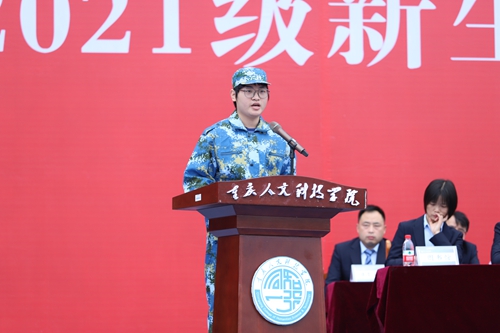 高年级学生代表、建筑与设计学院张皓天同学在发言中介绍了自己戍边卫国的经历,倡议全校退伍战友退伍不褪色、退役不退志,祝愿全体新同学在校度过精彩而有意义的大学时光,未来回首不因虚度年华而悔恨,不因碌碌无为而羞愧。