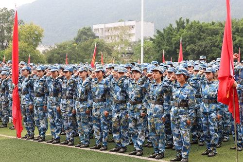 全体新同学举起右拳,在军训团旗前作出庄严宣誓:作为新时代的大学生,我志愿参加军事训练,认真学习军事理论,努力掌握军事技能,服务命令,听从指挥,强健体魄,磨练意志,吃苦奉献,不怕困难,坚决完成军训任务。
