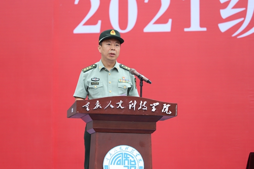 王利军上校在军训动员讲话中代表合川区人民武装部向全体新生表示热烈祝贺,向参加和支持军训的学校领导、老师和教官表示衷心感谢。他表示,强国必须强军,军强才能国安。军训是学生接受国防教育的基本形式,是培养和储备中国人民解放军后备兵员及预备役军官、壮大国防力量的有效手段。要求全体新同学一是要做好角色转变,二是要克服畏难情绪,三是要实现自身成长。希望全体承训教官科学施训,文明施训,以高度的责任心和使命感忠诚履职,加强协作,密切配合,从严教育,从严管理,以身作则,率先垂范;全体新同学珍惜当下,刻苦训练,用响亮的口号、拼搏的汗水,把个人志向定位于国家发展、社会脉动的时代坐标之上。