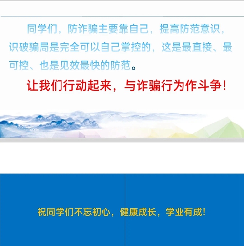 讲课结束时,张跃光要求全体新生要做好严守纪律抗新冠肺炎疫情、熟悉环境转换角色勤学习、确定目标为之努力不懈怠、爱惜粮食不攀比勤俭节约、防诈骗与不良贷确保安全等五件事,特别介绍了当前诈骗的常见方式,提醒全体新生自觉行动起来,与诈骗行为作斗争。