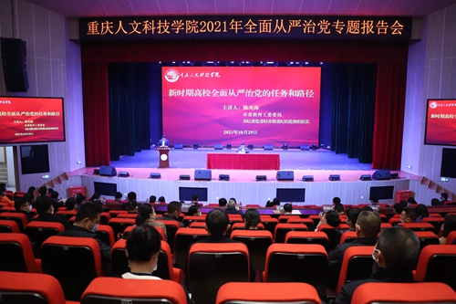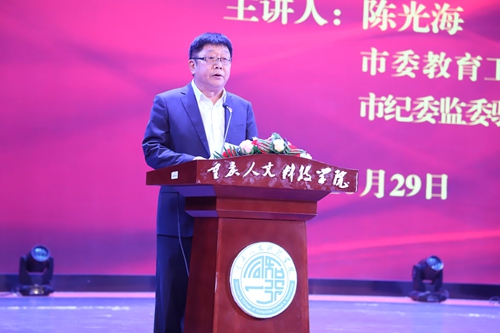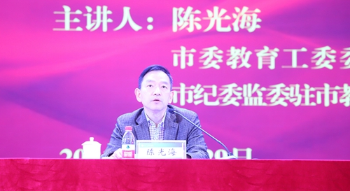 10月29日上午,学校党委在行知艺术中心召开了2021年第9次党委理论学习中心组(扩大)学习会暨全面从严治党专题报告会。报告会邀请到市委教育工委委员、市纪委监委驻市教委纪检监察组组长陈光海作“新时期高校全面从严治党的任务和路径”专题辅导。全体校领导,副科级以上干部,2021年第一期纪检监察干部培训班全体人员,党委部门和风险防控重点职能部门工作人员200余人到场听课。党委书记、政府督导专员张辉主持报告会。