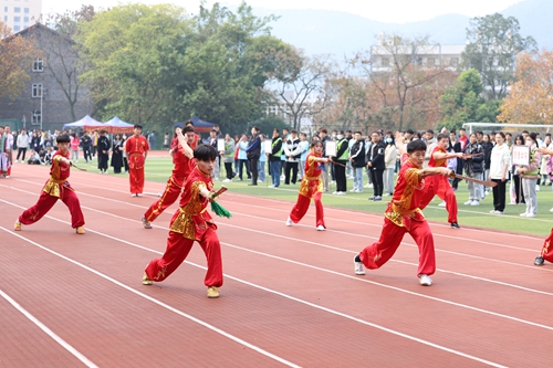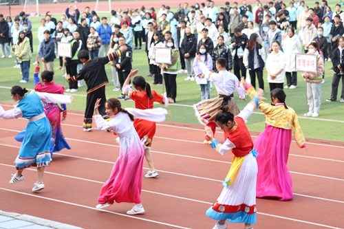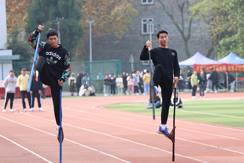 随着后台主持人的解说,赛会分别向大家展示了高跷竞走、三人板鞋竞速、传统武术以及民族啦啦操表演项目,引起了现场师生的热烈欢呼。