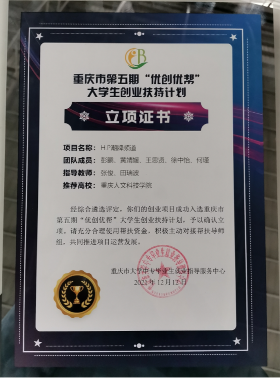 12月12日,由市教委主办,重庆市大学中专毕业生就业指导服务中心、重庆育成发展有限公司承办的重庆市第五期“优创优帮”大学生创业扶持计划市级总评审在西部(重庆)科学城大创谷·梦花园举办,beat365官网选送的创业项目“H.P潮牌频道”成功入选市级30强,获得2万元的项目扶持奖励资金。同时,该项目与重庆市创业导师、重庆市创业联盟科技有限公司董事长钟声现场“牵手”,签订结对帮扶协议,接受一年的帮扶指导。