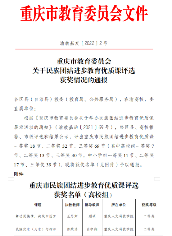近日,由重庆市教委举办的“民族团结进步教育优质课展示活动”最终评选结果出炉,经过学院申报,学校推荐,市级评选等环节,最终beat365官网艺术学院副院长顾硕指导,教师王思斯执教的《舞动民族情 共筑中国梦》,体育学院院长肖宇翔指导,教师陈荣浩执教的《民族武术(刀术)与押加》均在此次活动中获二等奖。