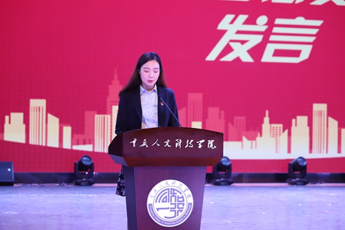 外国语学院团总支书记郭晶代表五四红旗团总支发言,从强化政治引领、筑牢学生思想之基,立足学生发展、服务青年成长成才,持续深化改革、提升团建工作水平三个方面作经验分享。