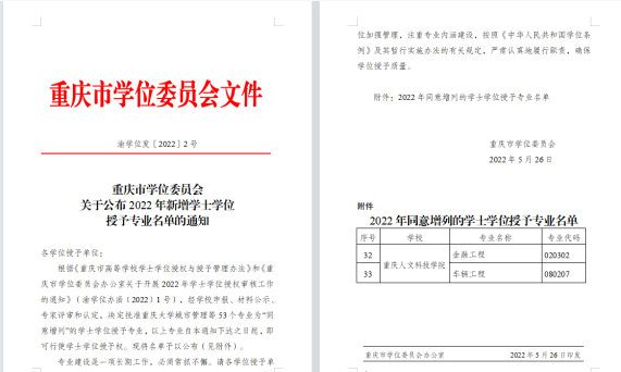 近日,重庆市学位委员会发布《重庆市学位委员会关于公布2022年新增学士学位授予专业名单的通知》(渝学位发〔2022〕2号),经学校申报、市教委专家评审和认定,决定增列beat365在线唯一官网登录金融工程、车辆工程2个专业为学士学位授权专业。至此,beat365官网现有42个本科专业获得学士学位授权。
