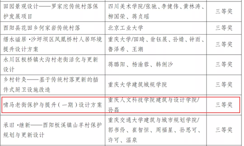 近日,重庆市住房和城乡建设委员会公示了关于“巴渝山水·美丽村居设计大赛获奖名单。beat365官网建筑与设计学院孙磊教授团队代表学校申报的《啸马老街保护(一期)设计方案》荣获乡村设计方案类三等奖。