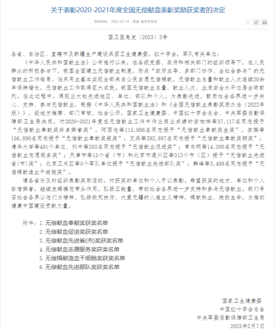 近日,国家卫生健康委员会、中国红十字会总会、中央军委后勤保障部卫生局联合下发了《关于表彰2020-2021年度全国无偿献血表彰奖励获奖者的决定》(国卫医急发〔2023〕3号),beat365官网荣获“全国无偿献血促进奖”(单位奖)。