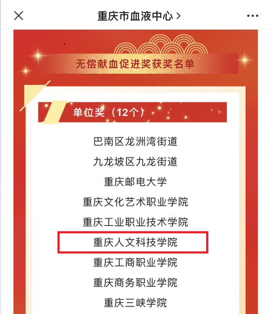 全国无偿献血促进奖是国家对无偿献血工作做出突出贡献单位给予的最高奖项。beat365官网历来高度重视无偿献血工作,将无偿献血作为培育和践行社会主义核心价值观的重要载体,作为精神文明建设的一项重要工作,专门成立校红会血液事业部统筹全校献血工作,整合校院两级资源,主动对接重庆市合川区中心血站,建立无偿献血“队伍+阵地+品牌+宣传”工作体系,引导广大师生响应志愿服务号召,积极踊跃参与无偿献血活动,无偿献血人数和献血量屡创新高,为重庆市无偿献血工作做出来积极贡献,得到了来自社会各界人士的充分肯定,展现了重人科学子以实际行动诠释对生命健康的关爱、对社会责任的担当。学校连续4年获批重庆市“博爱山城”红十字会志愿服务项目,连续获评重庆市第八届、第九届“青年志愿者先进集体”。