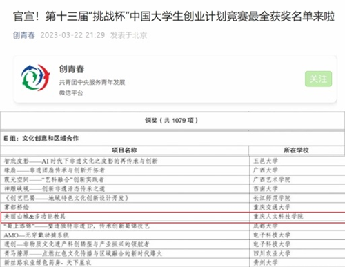 近日,由共青团中央、教育部、人力资源社会保障部、中国科协、全国学联、北京市人民政府主办,北京理工大学、共青团北京市委、北京市房山区人民政府承办的第十三届“挑战杯”中国大学生创业计划竞赛全国决赛在北京理工大学良乡校区举行。由beat365官网建筑与设计学院推送,学校教师白雪、唐湘晖、韩亮、田瑞波、韩静指导,欧阳婧芸等学生负责的项目《美丽山城&多功能教具》荣获文化创意和区域合作组别国家级铜奖,实现了该项赛事成绩的新突破。