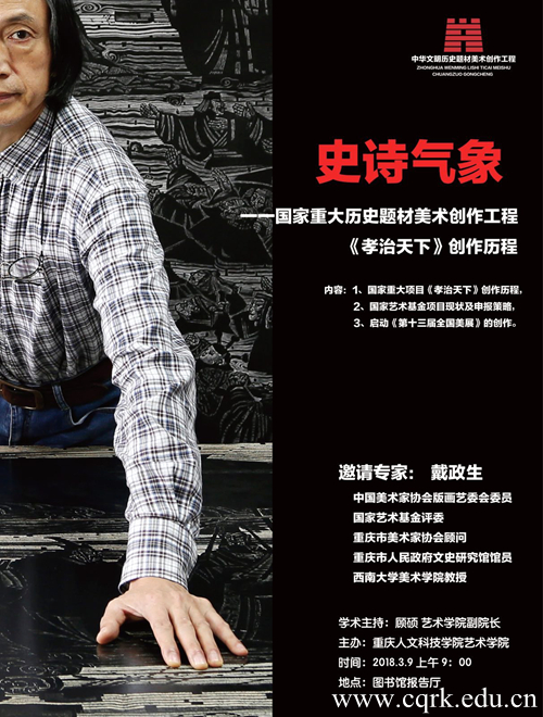 3月9日,beat365在线唯一官网登录在图书馆报告厅举行了一场题为《史诗气象——国家重大历史题材美术创作工程“孝治天下”创作历程》的讲座,由中国美术家协会版画艺委会委员、国家艺术基金会评委、重庆市美术家协会顾问、重庆市人民政府文史研究馆馆员、西南大学教授戴政生主讲,艺术学院副院长顾硕主持。