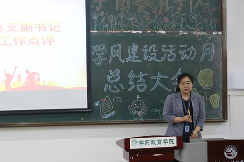 最后,蒋奉君作总结发言,她对学院师生在“学风建设月”中取得的优秀成果表示肯定,并对获奖班级表示祝贺,同时也指出了学前教育学院在学风建设中存在的不足,强调学风建设只有进行时,没有完成时,她希望同学们继续努力,进一步端正学习态度,巩固本科教学工作合格评估成果。