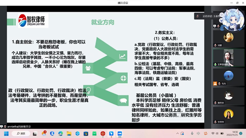 王春雪从“疫情带来的影响”“法学生的就业方向”“如何抉择”“个人建议”四个方面展开分享,解读就业政策的同时,结合往届生去向数据,分析当前就业环境以及就业难点,为同学们择业提供了有力指导。她指出,要想成为法律人,必须要认真学习专业课知识,拓展非专业领域学习,适当体育锻炼,增强心理素质,努力实现全面发展。
