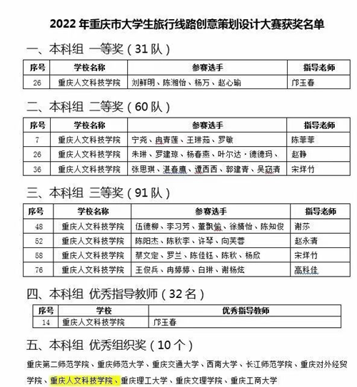 【喜报】beat365官网学子在“2022年重庆市大学生旅行线路创意策划设计大赛”中喜获佳绩