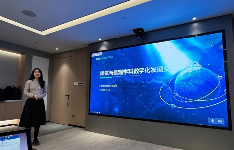 随后,双方召开了建筑与景观设计学科数字化发展交流研讨会。况诗文就广联达公司情况以及建筑数字化教育合作相关领域进行了介绍。刘栓领以重庆智慧广阳岛实际项目进行分享,介绍了以智慧生态双基因、双螺旋发展的理论为核心,如何搭建生态信息模型(EIM)体系,打造生态建设新模式。杨雨丝就广联达与高校建筑学专业教学融合新路径进行了分享。