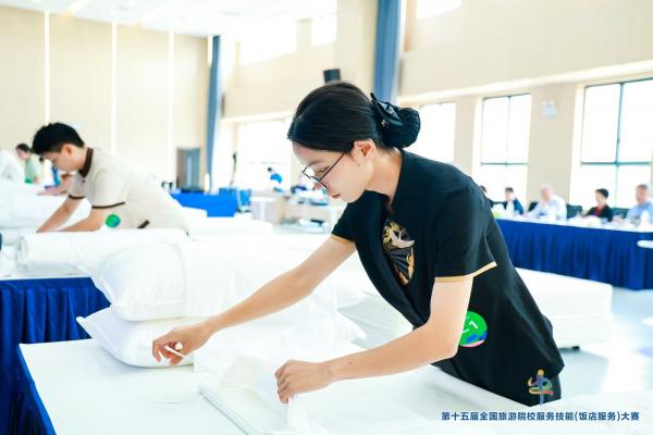本次大赛由中国旅游协会旅游教育分会、中国旅游饭店业协会主办,汇聚全国近200所旅游院校、千余名参赛选手,涵盖中餐、西餐、调酒、客房等四大赛项,是行业认可度高、影响力强的专业技能竞赛平台。管理学院积极组织备赛,选派曾涵湘、肖玲珑、谢汶珊、张艳洁四位同学代表参赛,由旅游管理系教师宋垟竹、柏爽、贺琳、夏知晓、谢莎、赵永青全程指导。